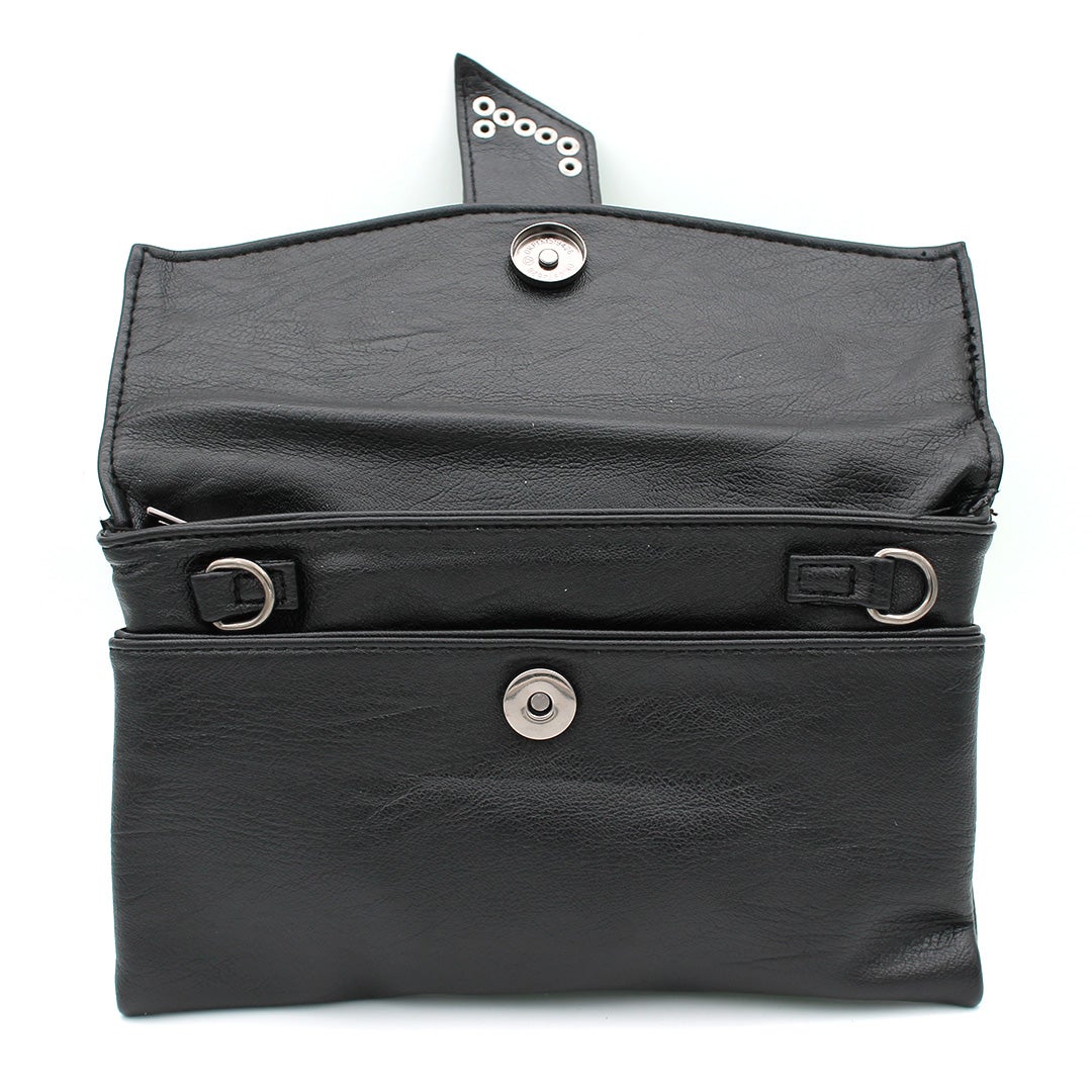 Keinonahkainen pieni kirjekuorilaukku. Koristeena pyöreitä niittejä ja solki.