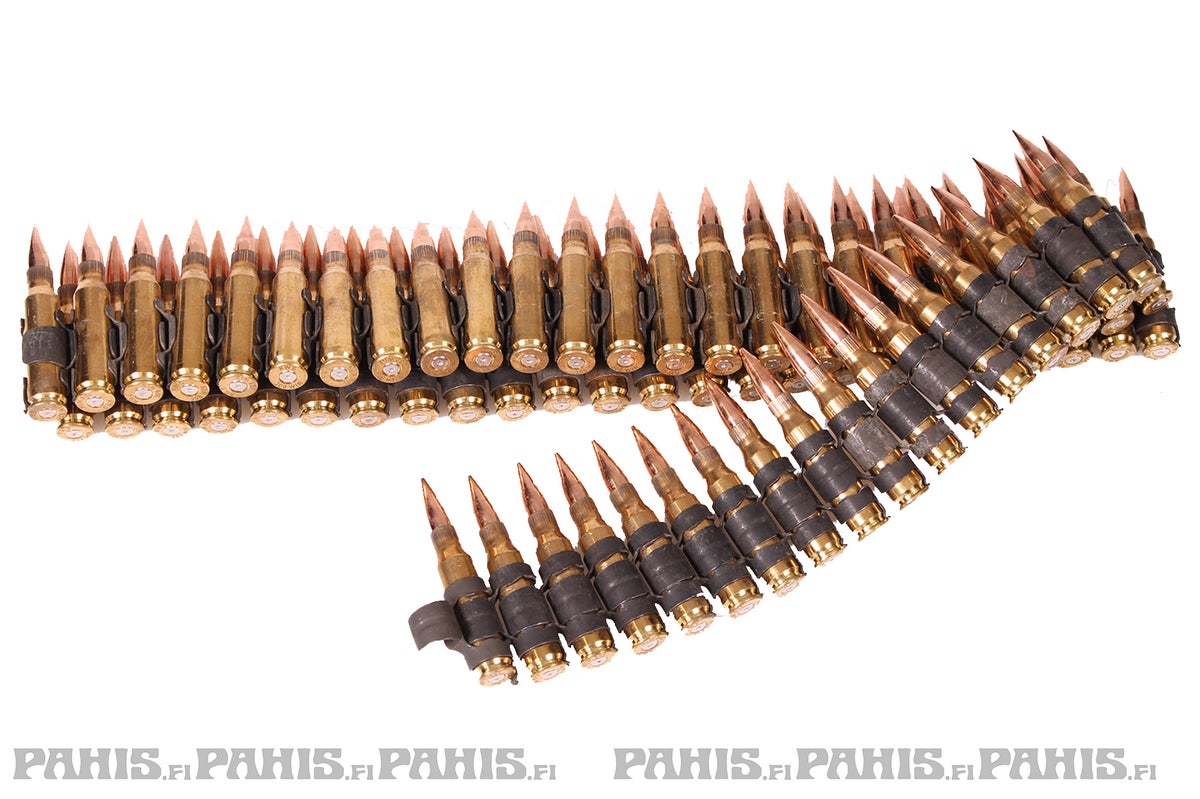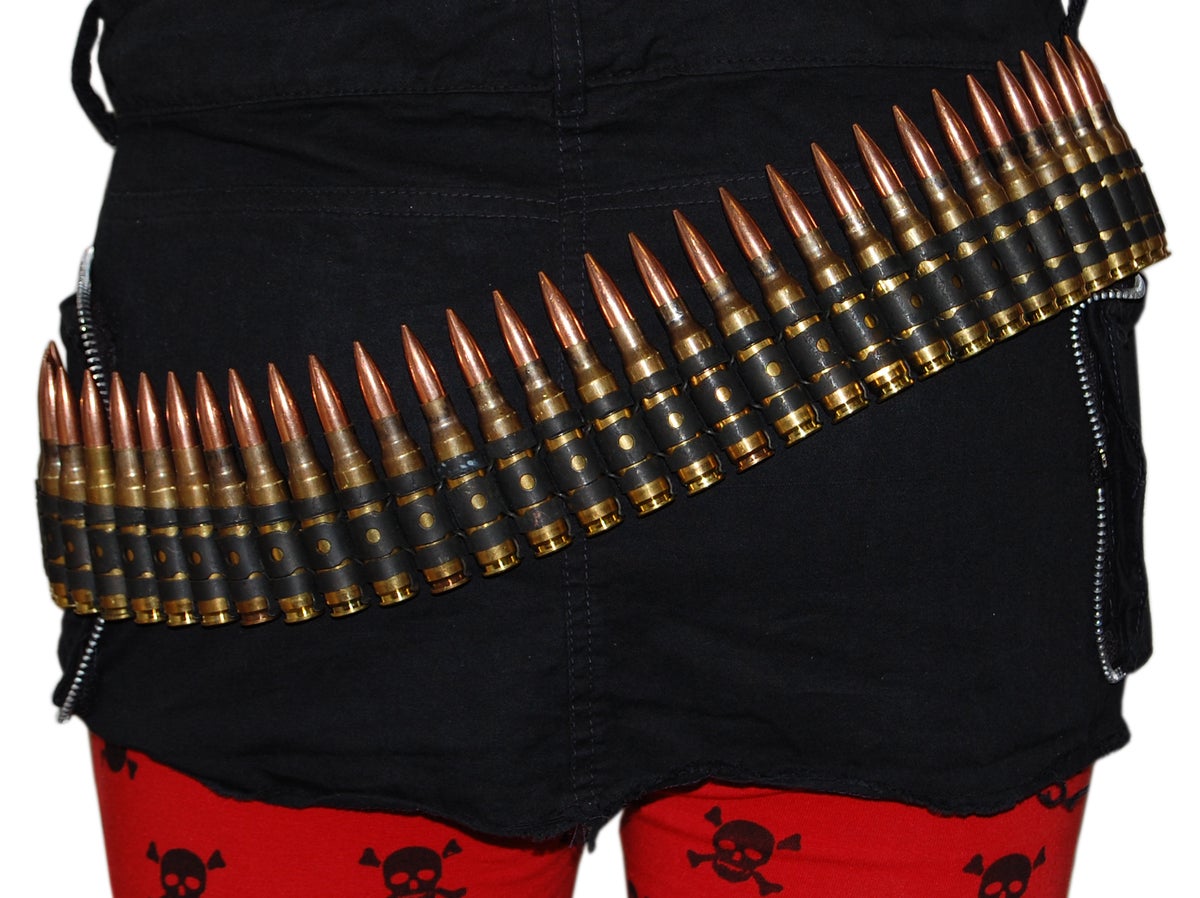 Näyttävä messinkinen panosvyö. 65 panosta.