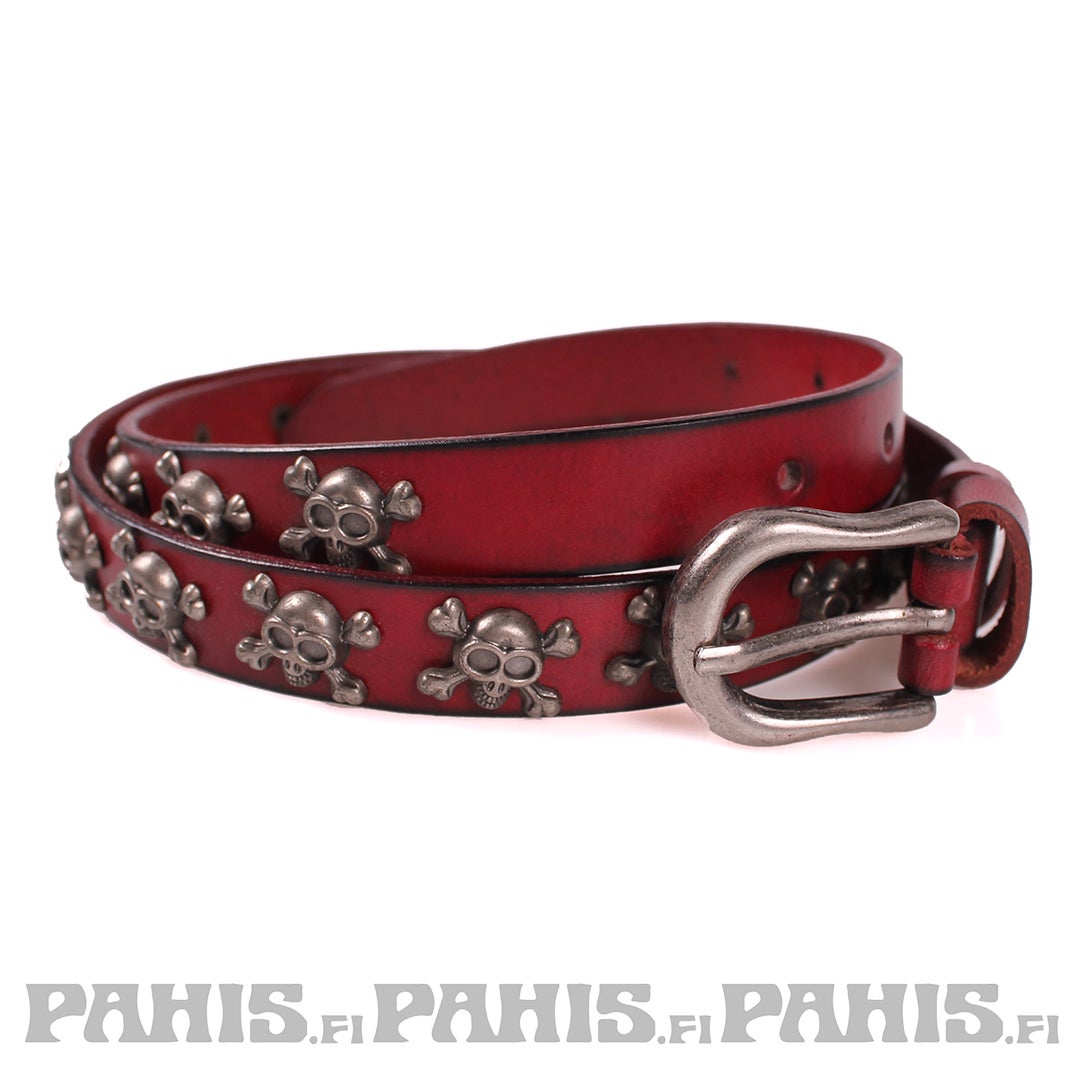 Erittäin laadukas ja tyylikäs vyö aitoa nahkaa.  Jämäkässä kapeassa vyössä pieniä pääkallo niittejä. Tummanharmaa metallinen harjattu solki.